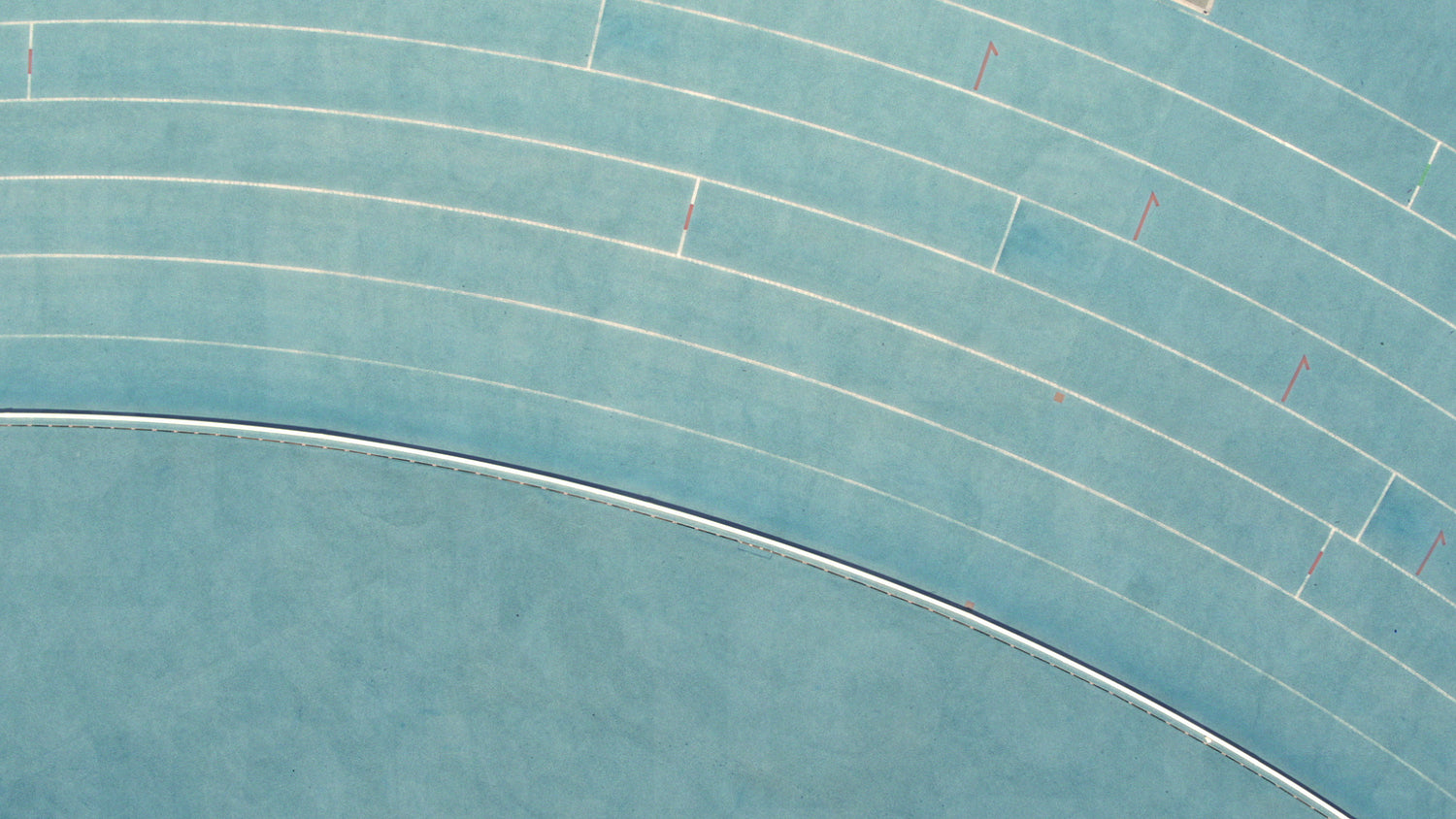 Aerial view of woman running on racetrack with national flag after the winning the race. Athlete running on athletic track holding the american flag over the head.