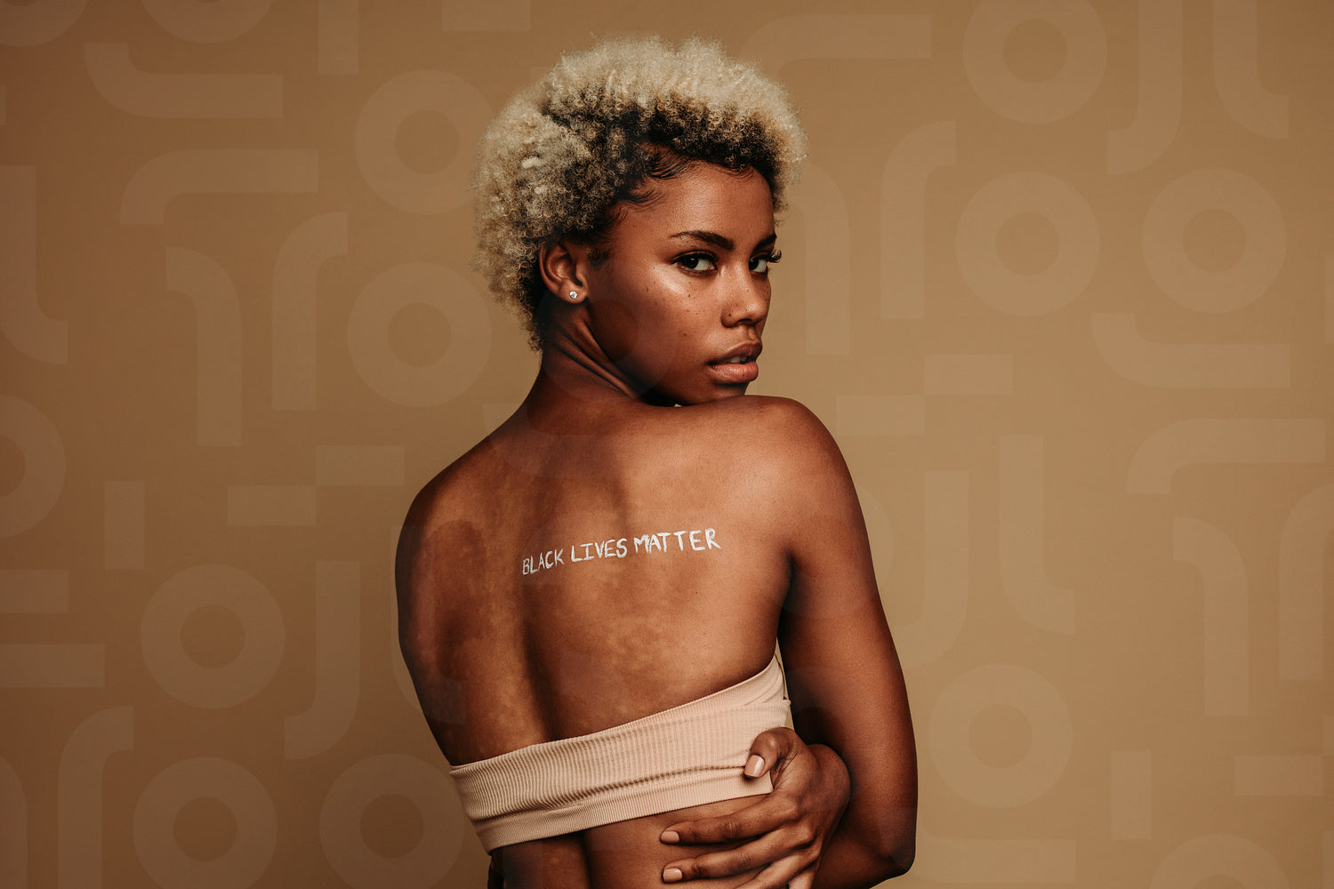 Rear view of woman standing on brown background with words black lives matter written on back. African american woman expressing anti racism views.