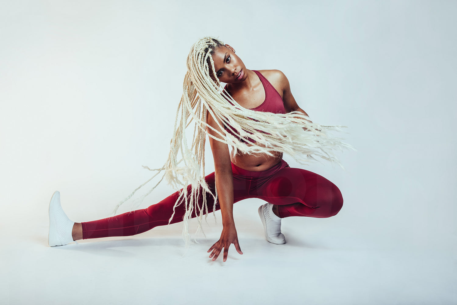 African american woman with long braided hair doing leg stretches on floor. Female athlete working out on flexibility exercises.