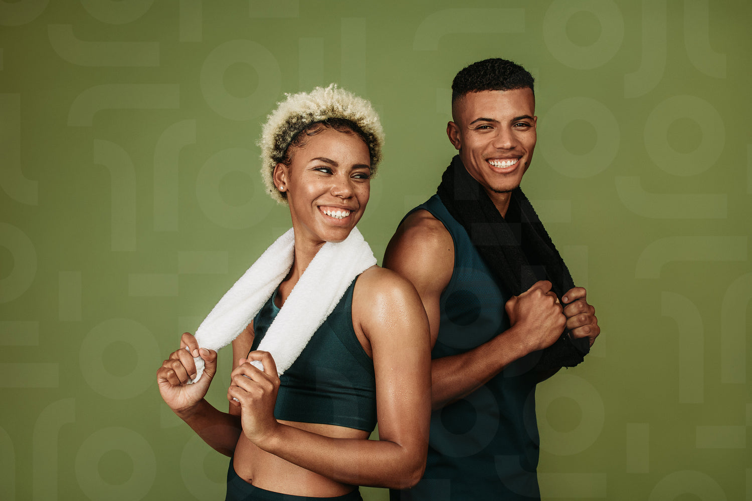 Smiling african american fitness couple relaxing after workout. Fitness man and woman standing together holding towels on green background.