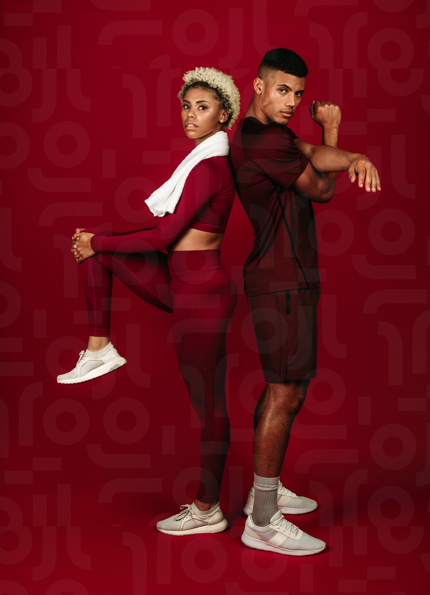 African american athletic couple doing fitness exercise together. Fitness couple standing with back against each other on maroon background.