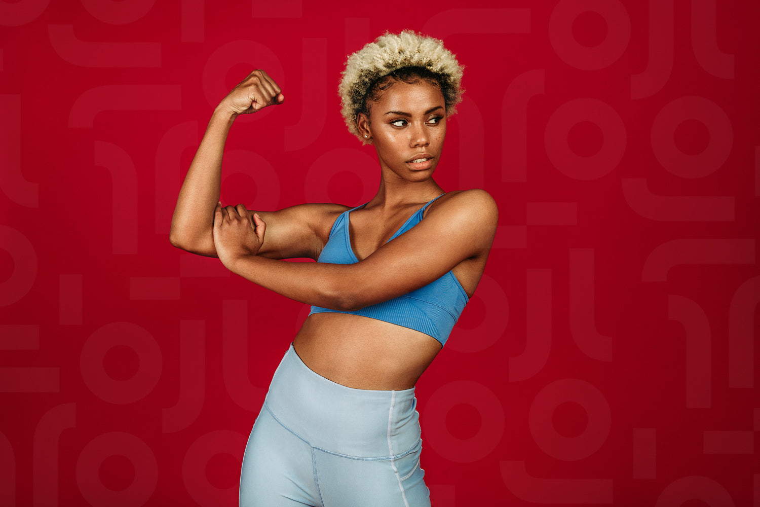 African american fitness woman standing against red background showing biceps. Portrait of woman in fitness wear doing workout.