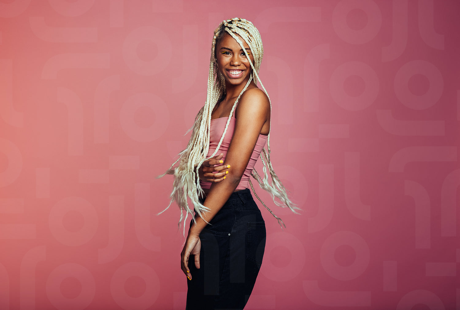 Side view portrait of smiling woman standing on pink background. Cheerful african american woman with long braided hair.