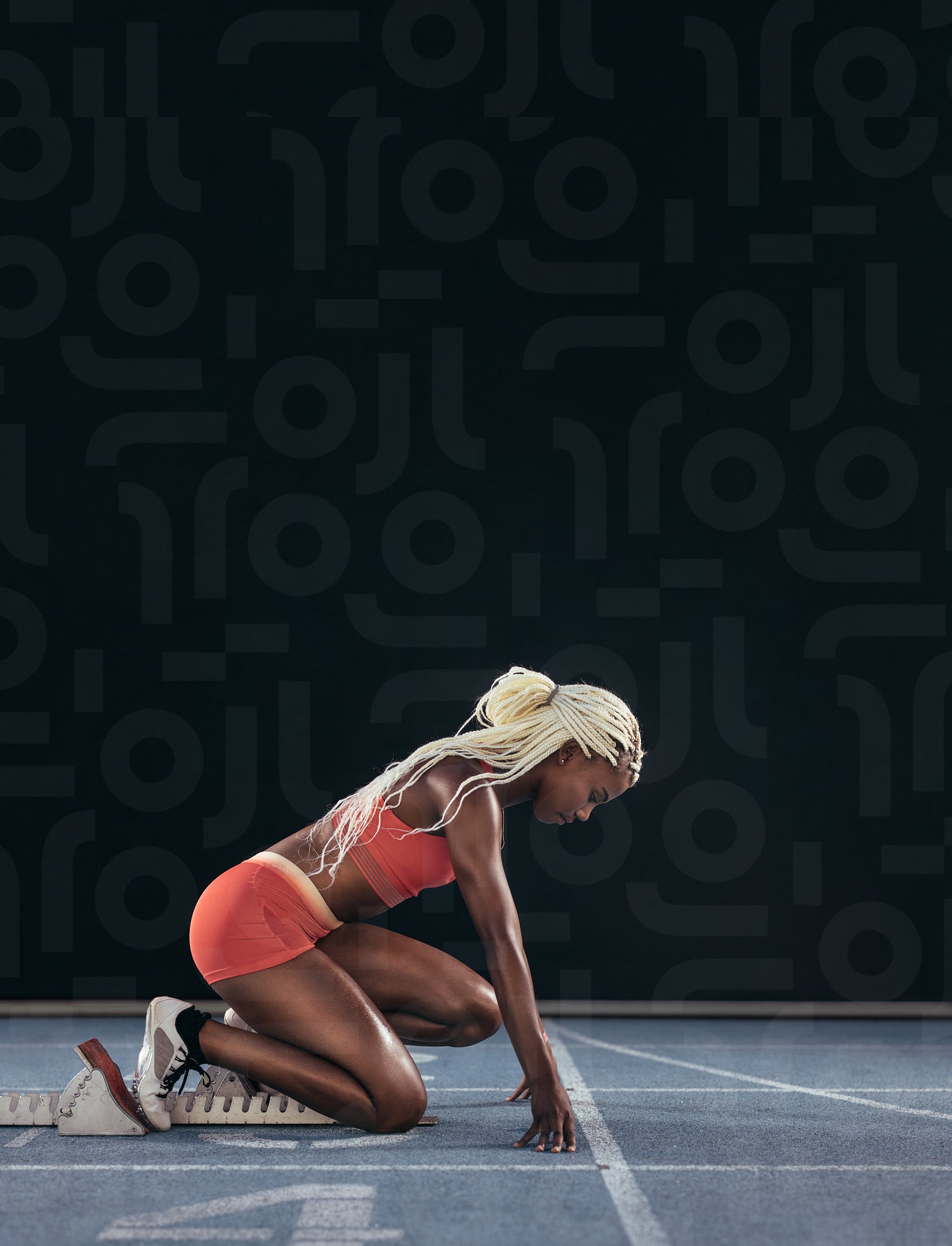Female athlete taking position on her marks to start off the run. Side view of female runner getting ready at the start line on running track on a black background.