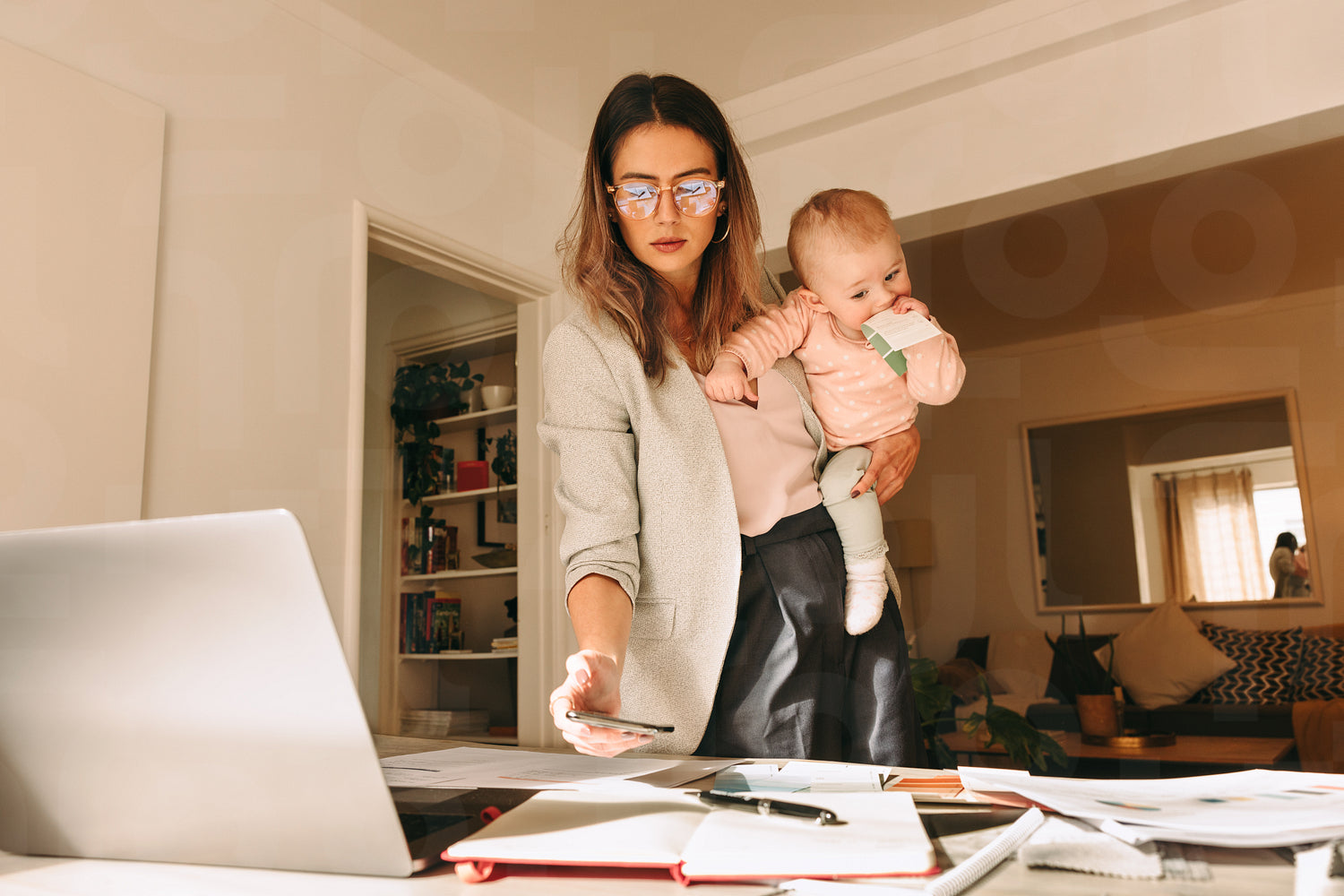 Female interior designer holding her baby while working on a new project. Multitasking mom taking a picture of her notes in her home office. Creative businesswoman balancing work and motherhood.