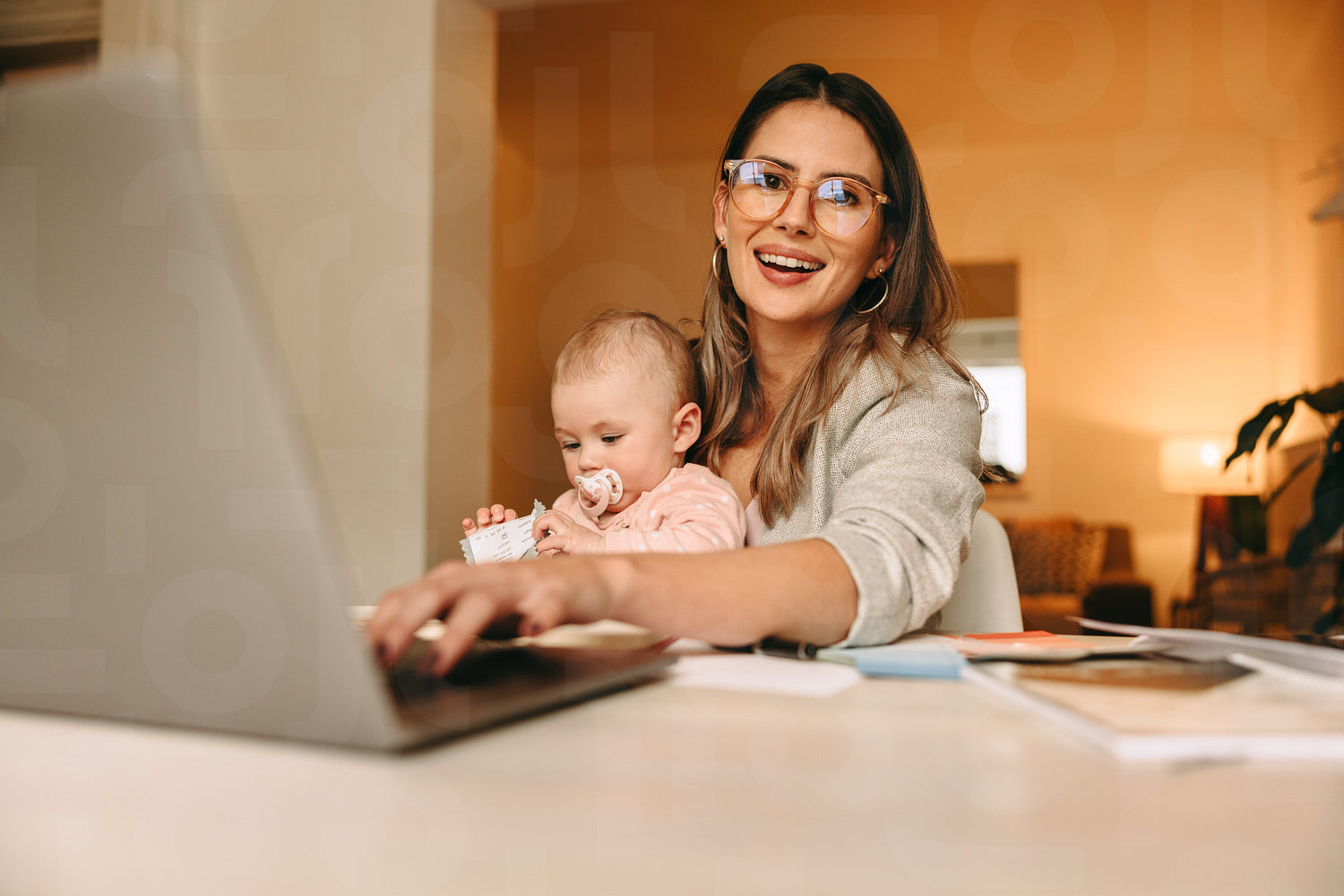 Happy single mom typing on a laptop in her home office. Multitasking mom working on a new creative project at her desk. Female interior designer carrying her baby on her laps.