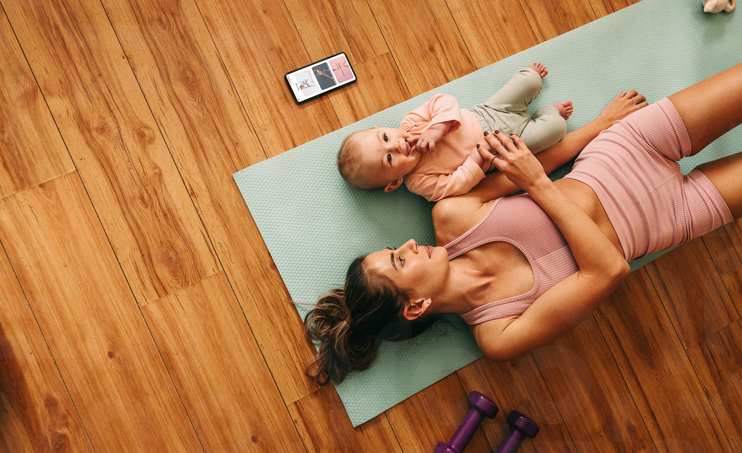 High angle view of a mom lying on an exercise mat with her baby. Mother and baby taking a break from working out. New mom bonding with her baby during her post-natal fitness routine.