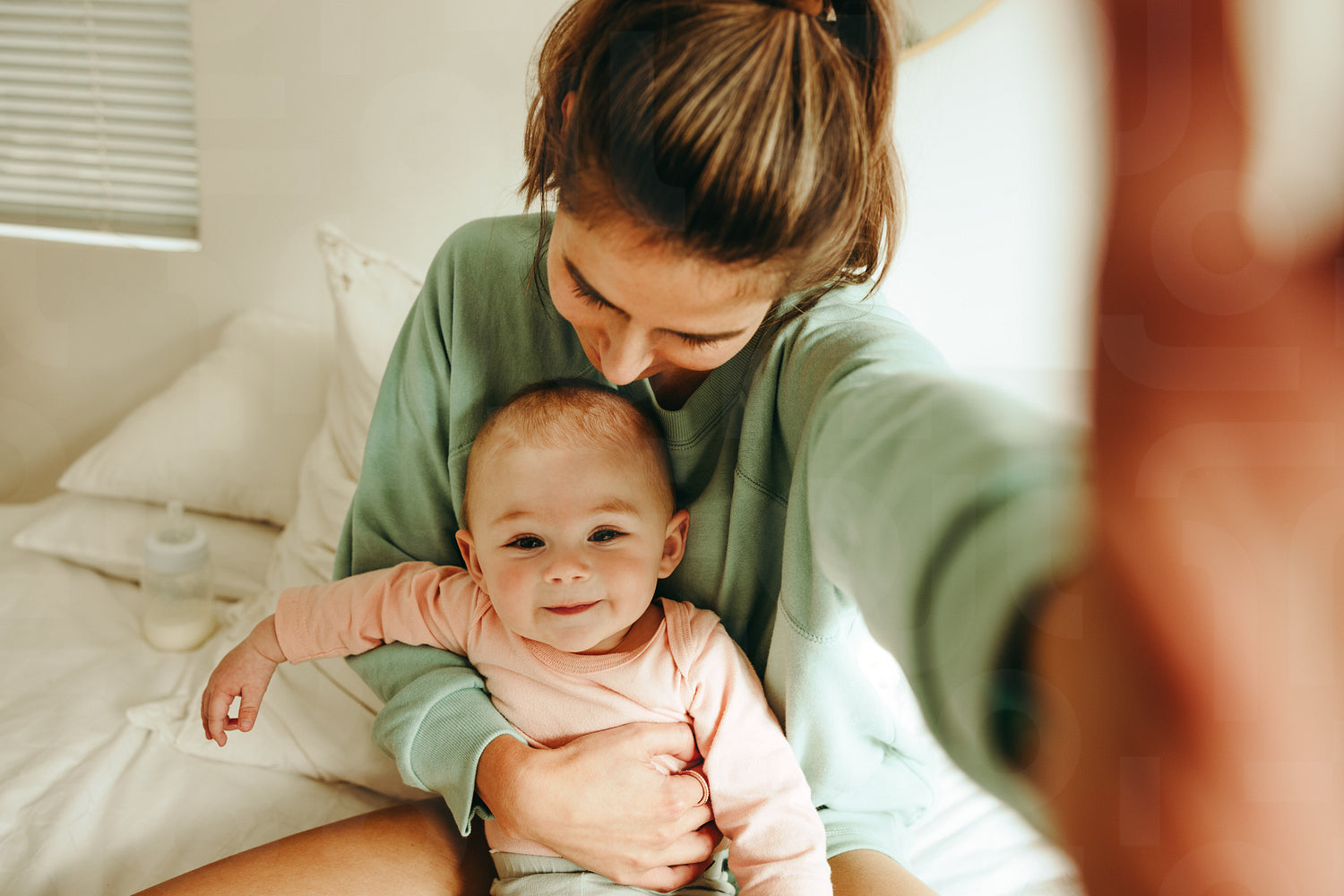 Millennial mom taking a selfie with her adorable baby. Happy single mom taking a picture while sitting with her newborn baby on the bed. New mom creating cute memories with her infant child.