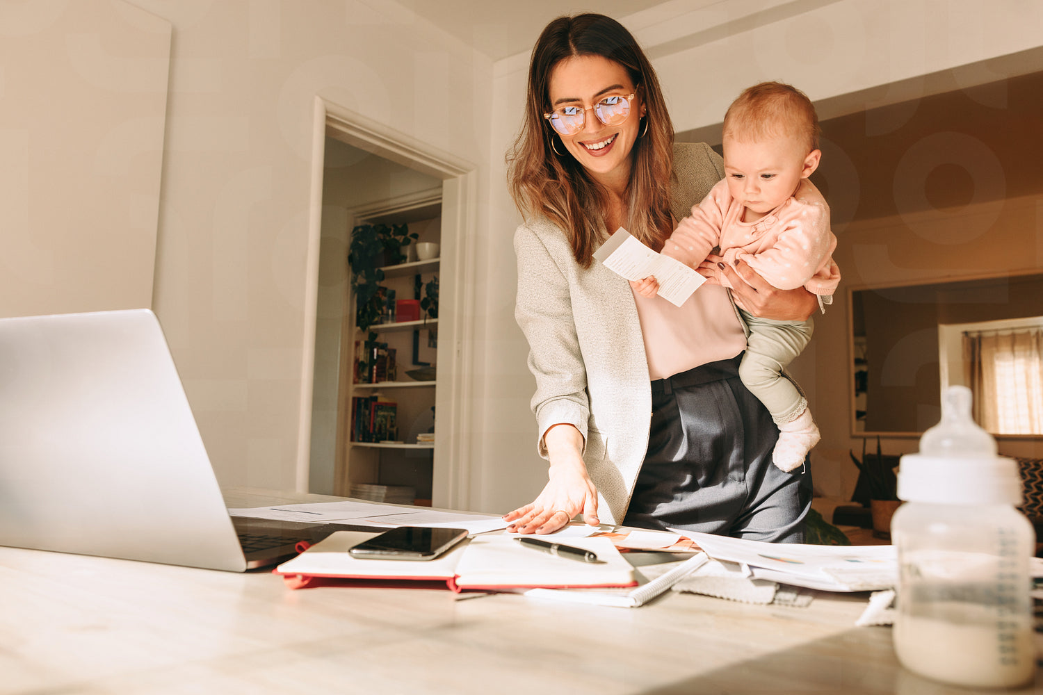 Cheerful mom holding her baby while working on a new project in her home office. Happy single mom smiling at the swatches on her desk. Female interior designer balancing work and motherhood.