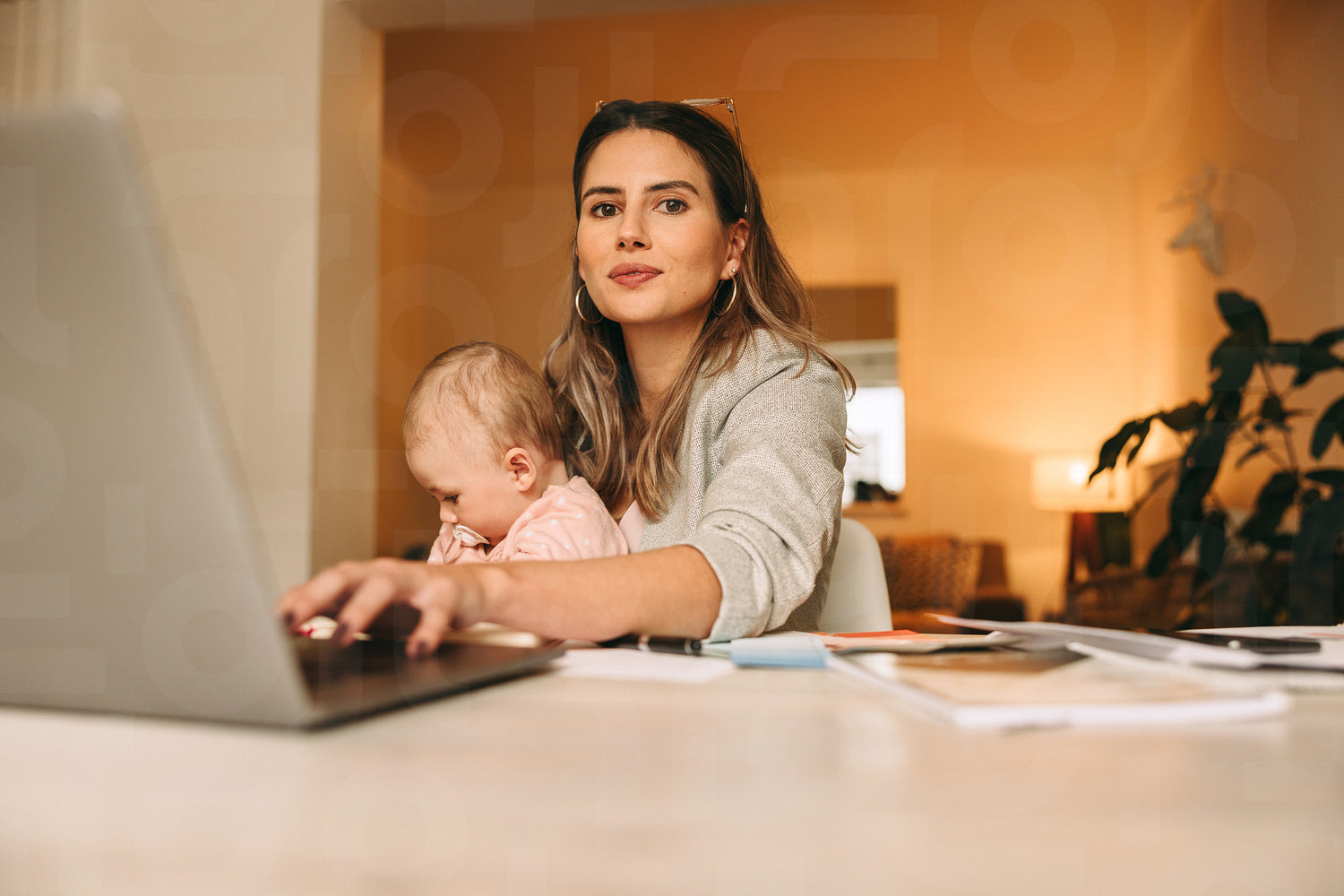 New mother typing on a laptop while working in her home office. Multitasking mom working on a new creative project at her desk. Female interior designer carrying her baby on her laps.