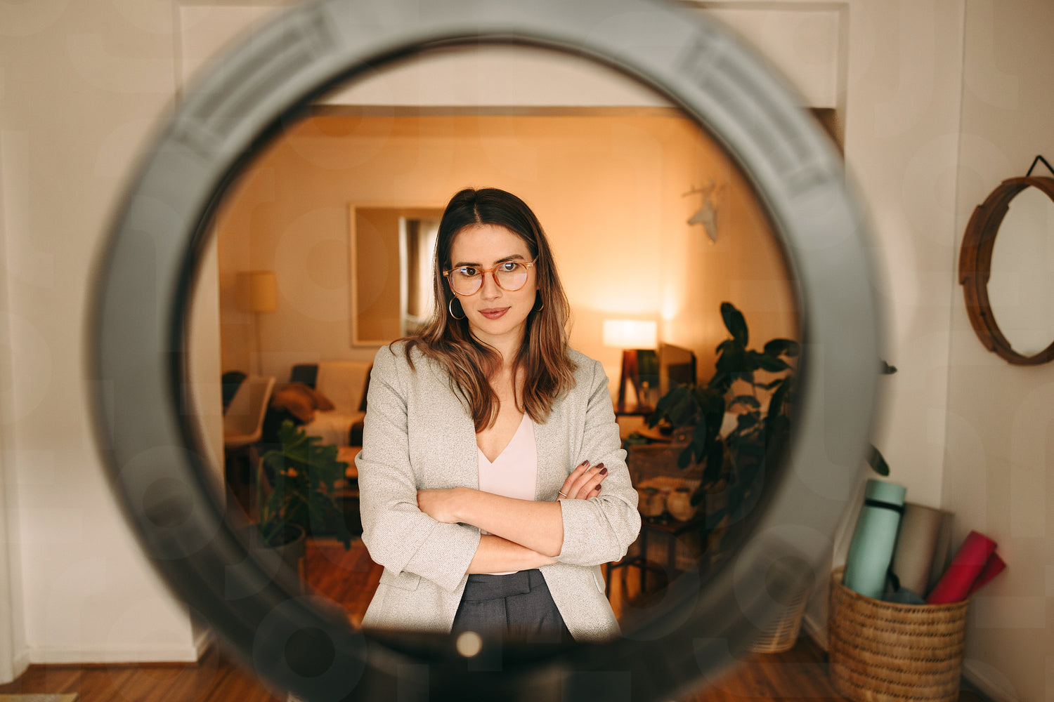Vlogger standing in front of a ring light at home. Confident influencer standing with her arms crossed while recording a video. Content creator making a video blog for her social media channel.