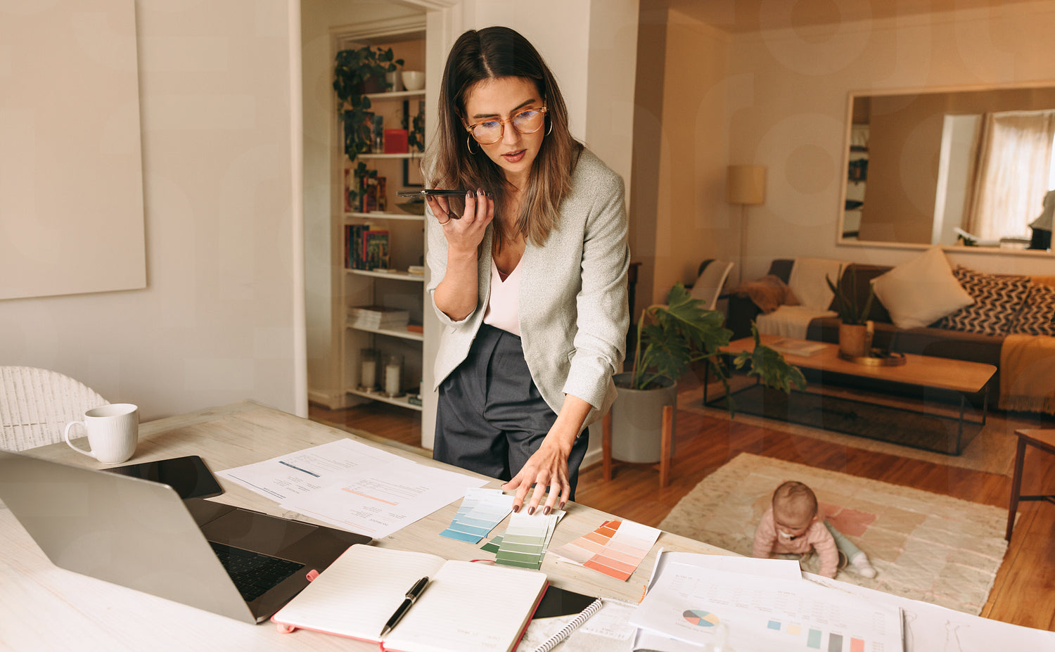 Working mom speaking on the phone in her home office. Female interior designer looking at colour palettes during a phone call. Single mother planning a new project with her baby in the background.