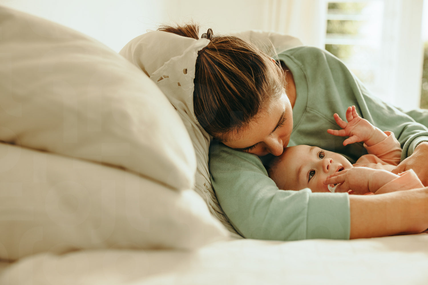 Young mother taking a nap with her arms around her baby. New mom resting while her baby plays with a pacifier. Mother and baby lying on the bed together at home.