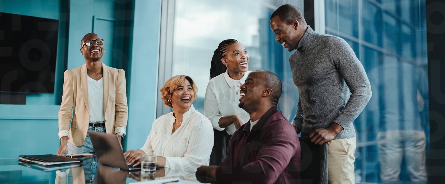 Business professionals collaborate in a modern office, using technology and working together. With smiles on their faces, they have a successful meeting, displaying teamwork and professionalism.