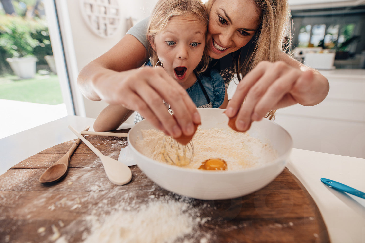 Mother and daughter making dough in kitchen. Woman adding egg to the batter and little girl with amazed expression.