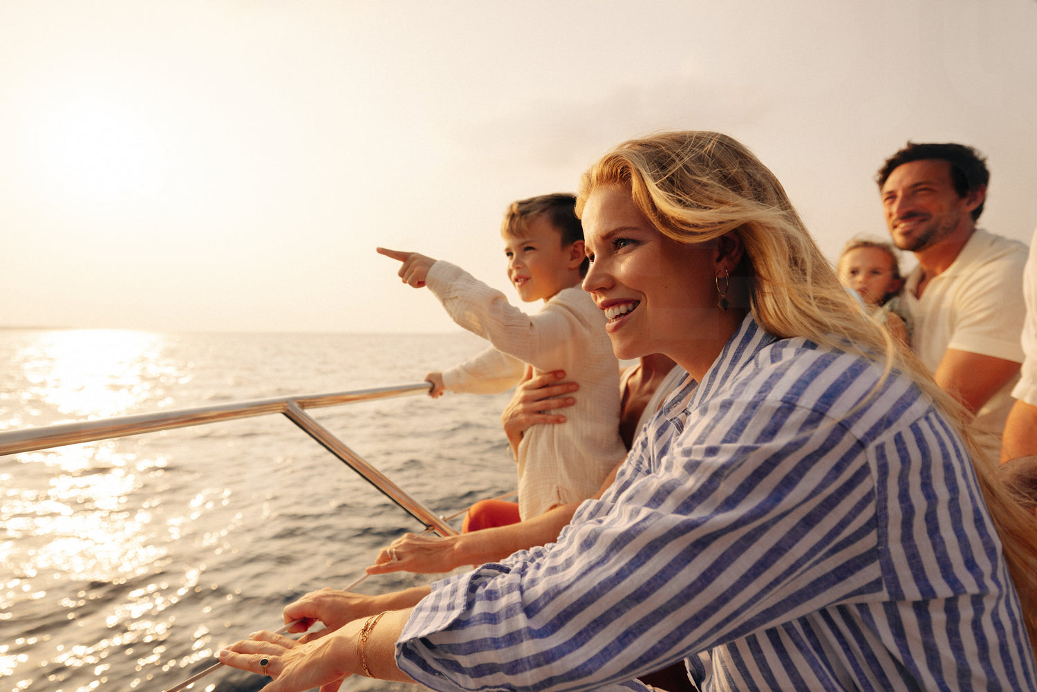A family enjoying a special moment together on a boat during sunset. The scene captures joy, togetherness, and the beauty of nature.