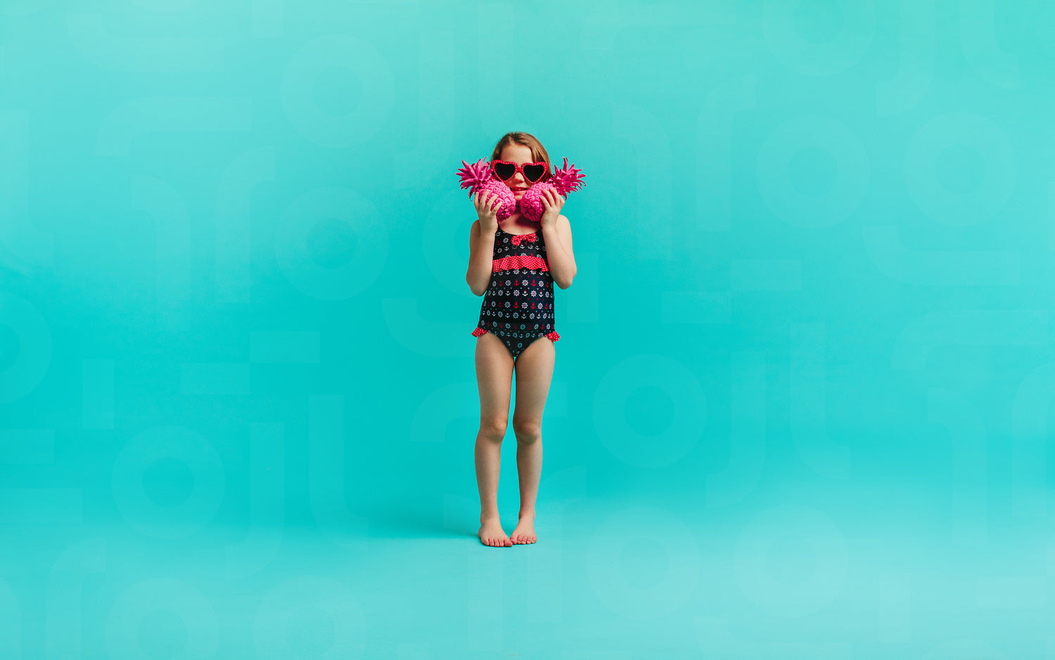 Full length of a young girl holding two pink coloured pineapples. Small girl wearing swimwear and heart shaped sunglasses over blue background.