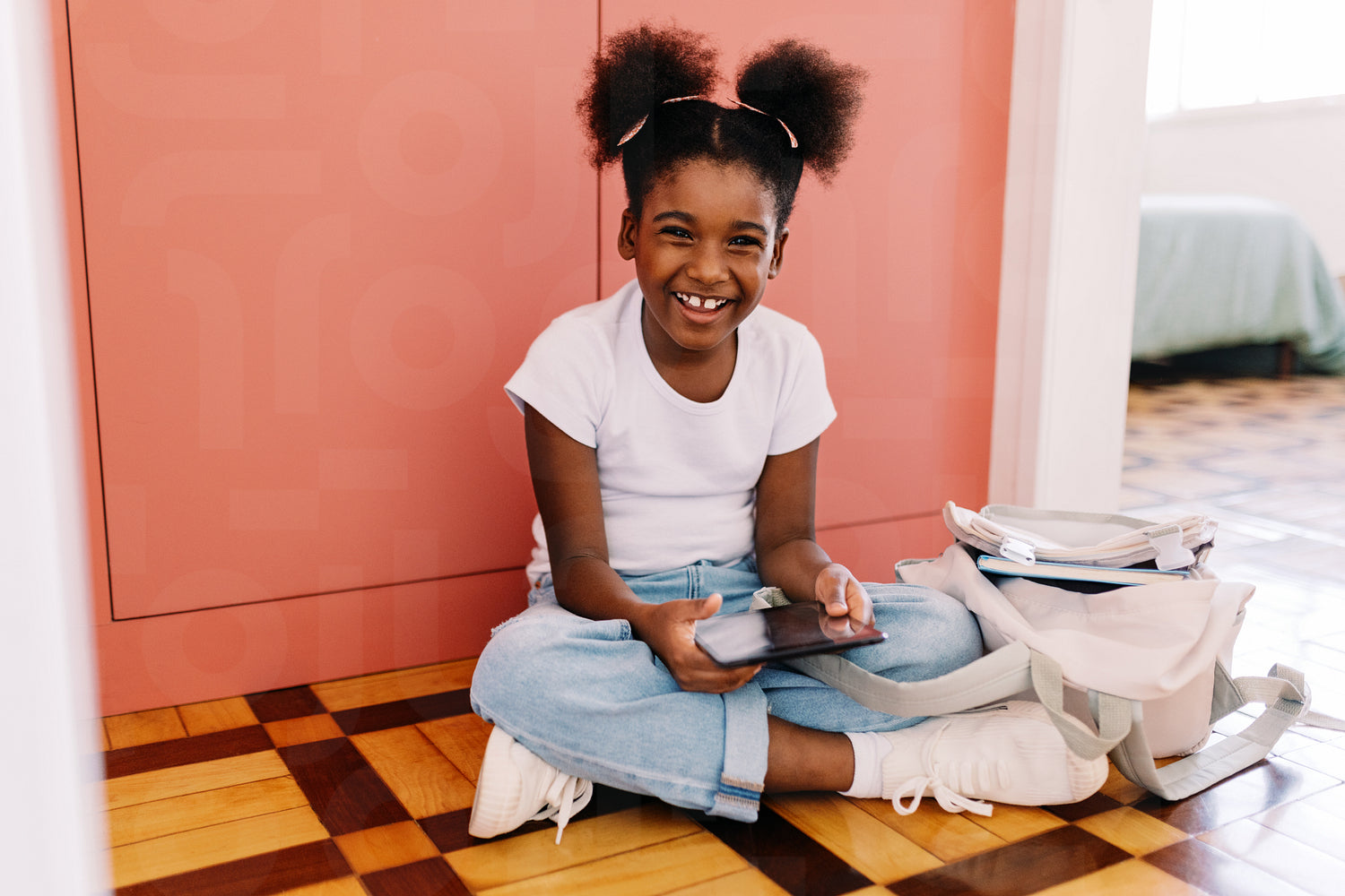 Black girl sitting at home, studying with a tablet for her e-learning activities. Happy schoolgirl completing her schoolwork with focus and dedication.