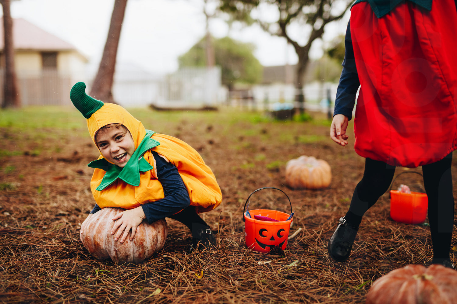 Happy little girl in halloween costume trying to pick a big pumpkin from ground. Little children having fun on halloween.