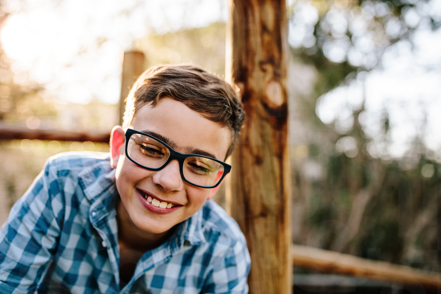 Close up of a smiling young boy outdoors. Happy teenage boy in eyeglasses playing outdoors.