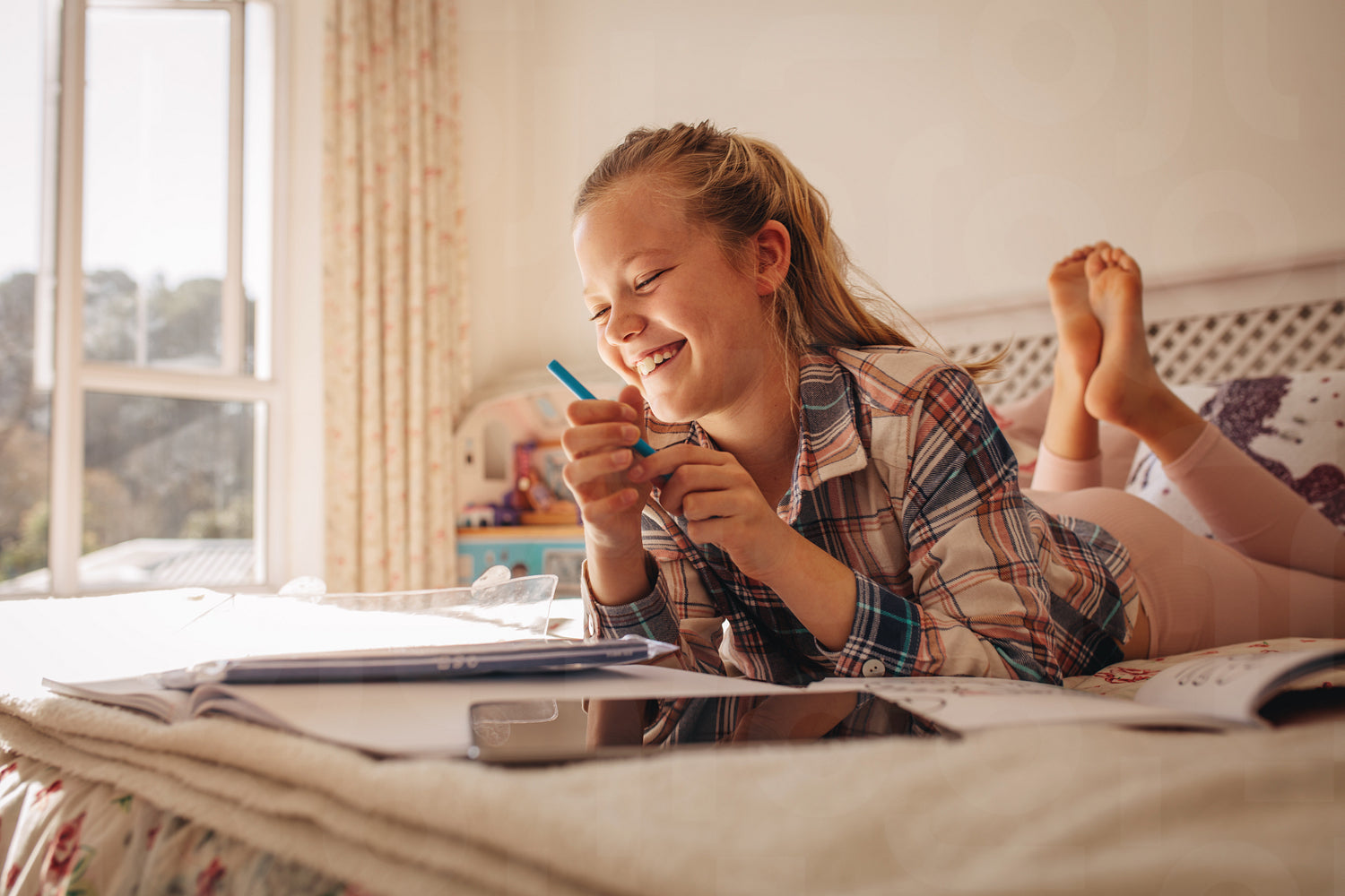 Smiling girl lying on bed with books. Girl studying while lying on bed at home.