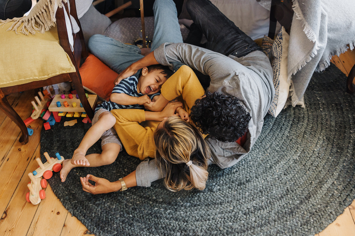 Top view of a little boy having fun with his mom and dad in their play area. Young boy laughing cheerfully while playing with his parents. Family of three spending some quality time together.