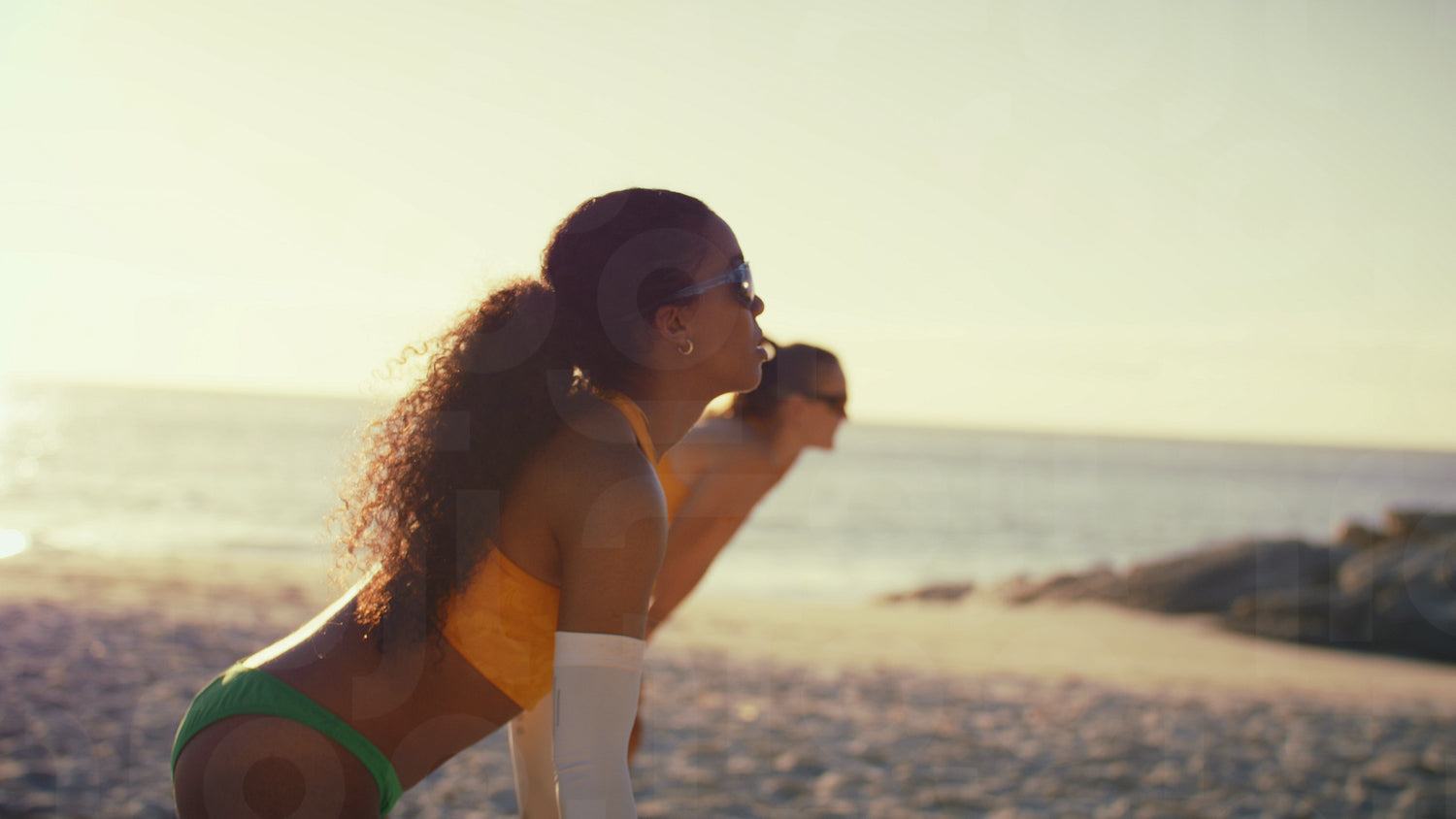 Two dynamic female athletes play beach volleyball as a team at sunset. Displaying grit and determination as they jump for the ball.