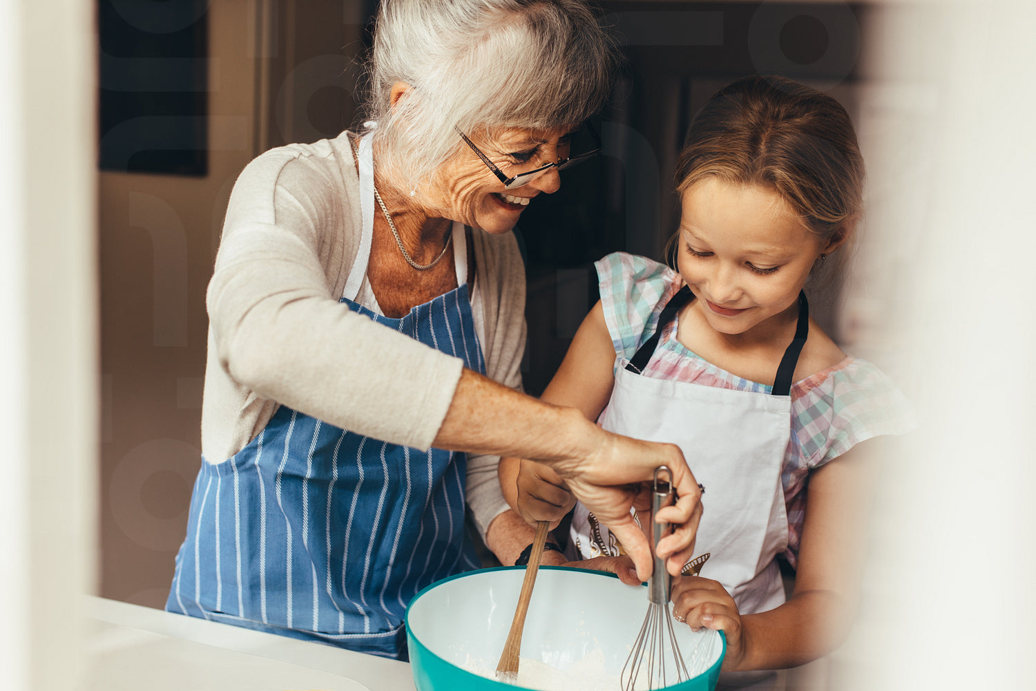 Senior woman teaching a kid to make batter for cake. Smiling grandmother and girl mixing batter in a bowl.