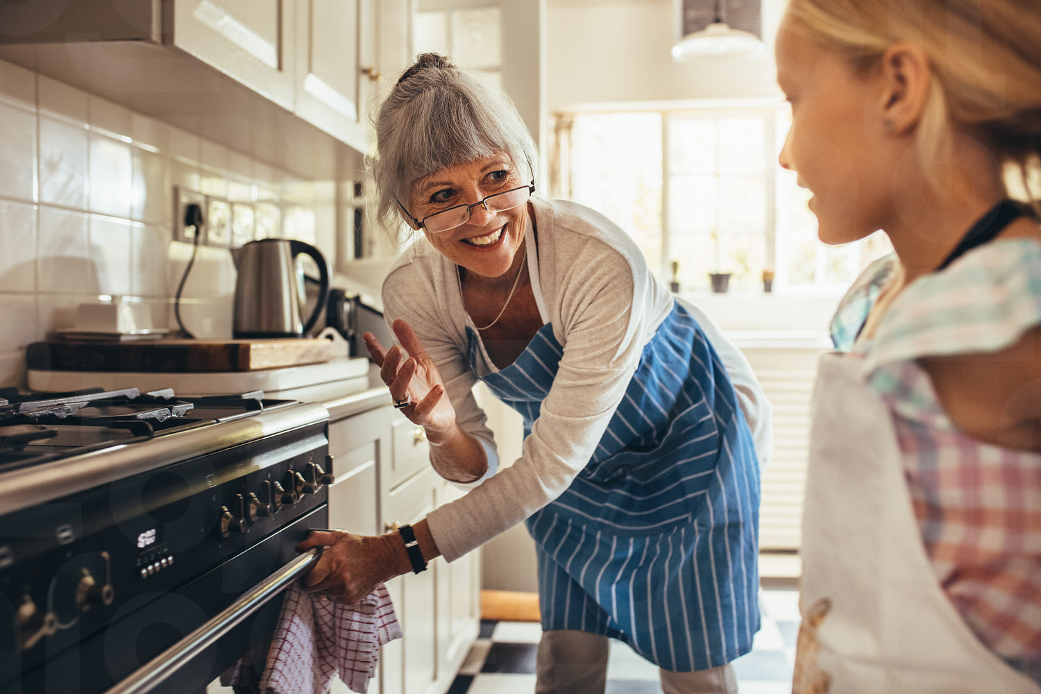 Smiling senior woman in apron opening the oven door. Happy granny and kid in kitchen cooking together.
