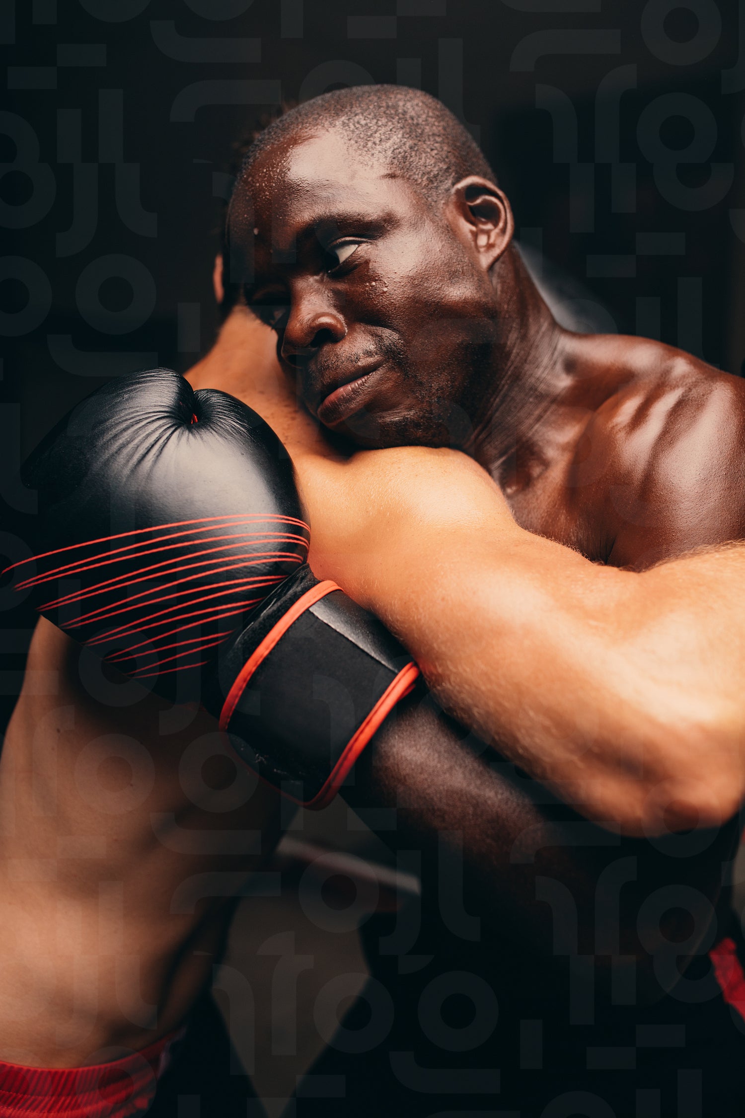 Two male athletes fighting with boxing gloves in a gym. Two young boxers having a match in a boxing ring.