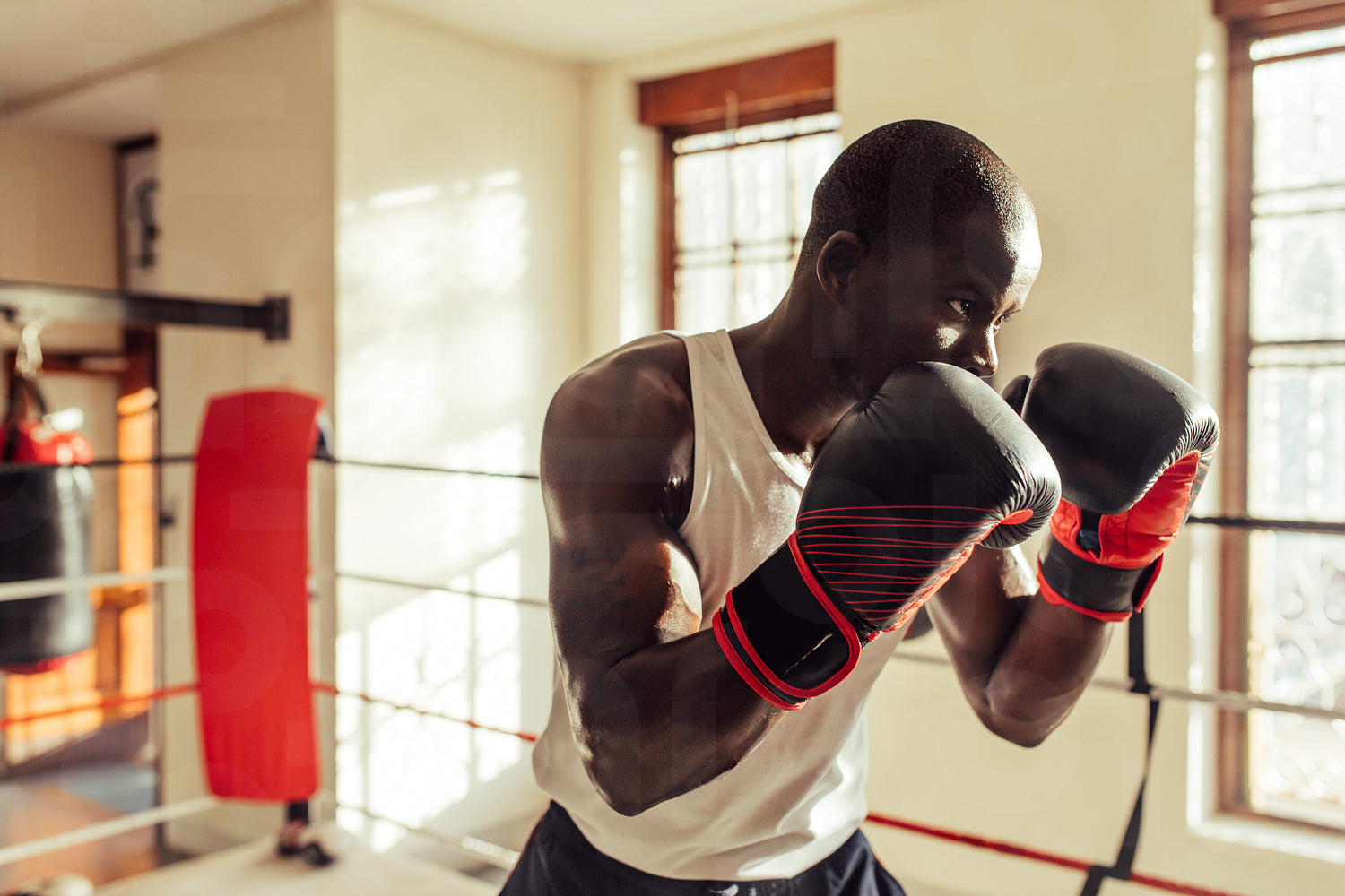 Young male boxer standing in a fighting position while wearing boxing gloves. Sporty young man having a boxing training session in a gym.