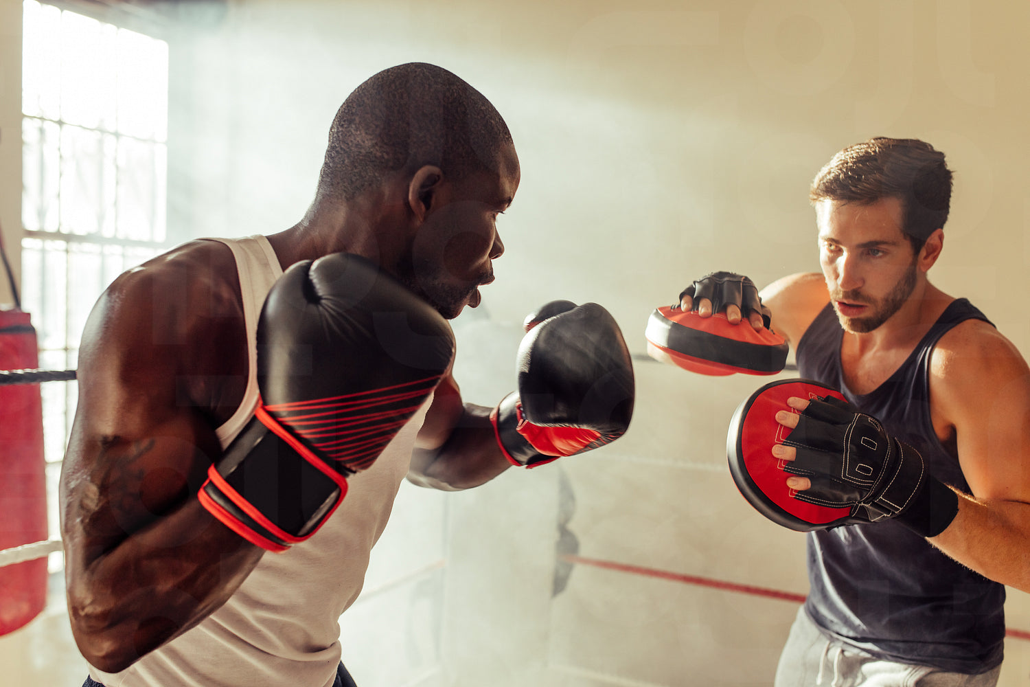 Athletic young man working on punching combinations with the focus mitts held by his personal trainer. Young boxer having a training session with his coach in a gym.