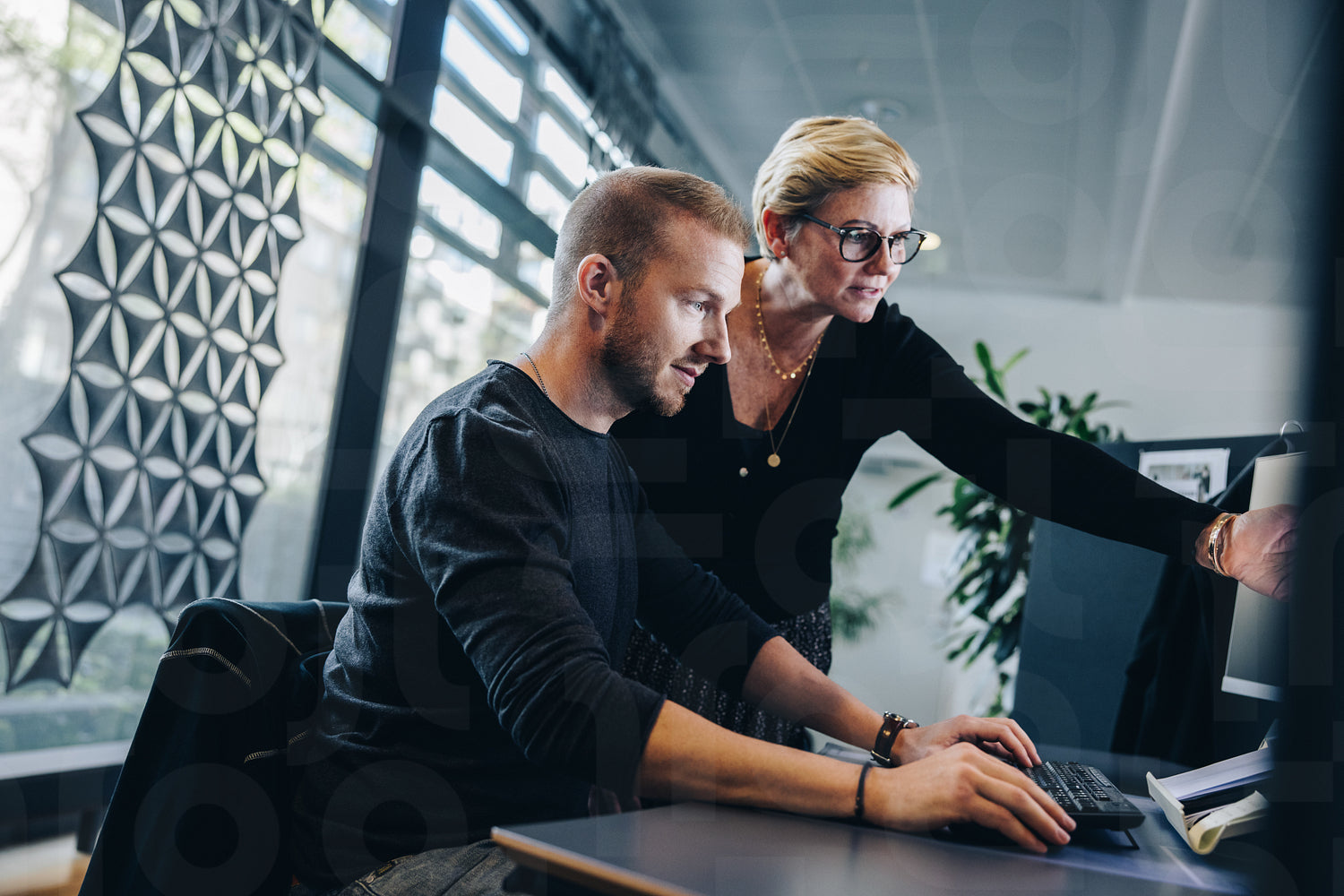 Senior businesswoman pointing at computer monitor and discussing work with male colleague sitting at desk. Two business professionals working together on a project.