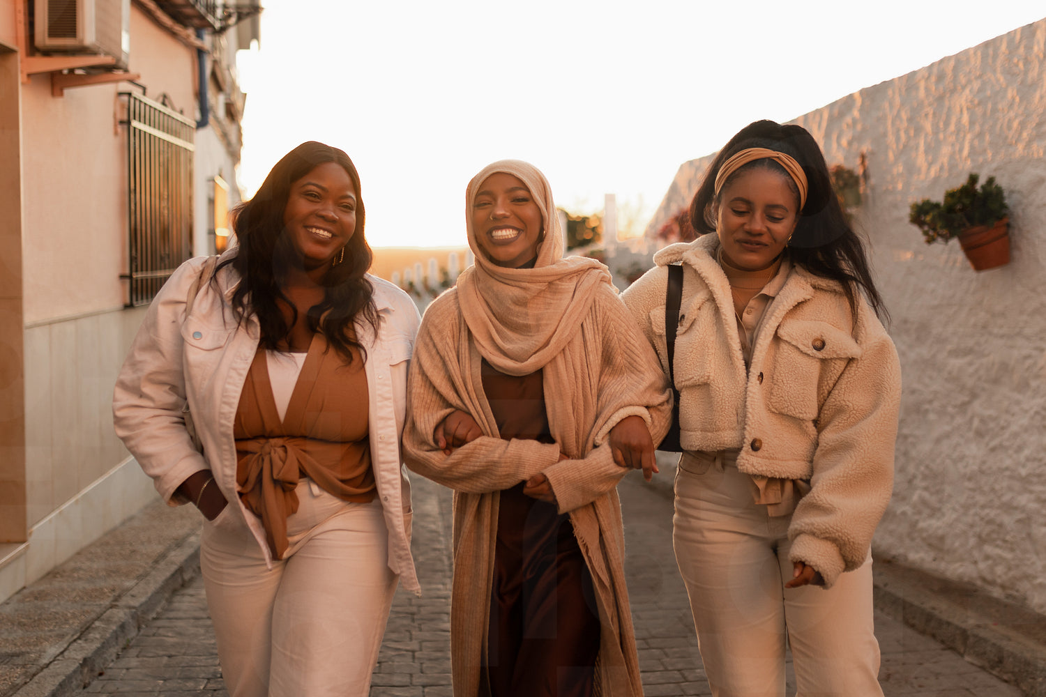 Cheerful friends smiling while walking together outdoors. Group of multicultural female friends walking through a pavement at sunset. Three ethnic friends hanging out together on the weekend.
