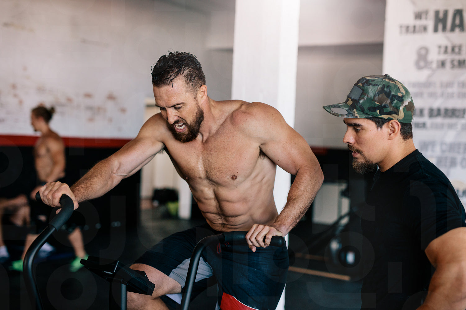 Muscular man exercise on stationary bike with personal coach