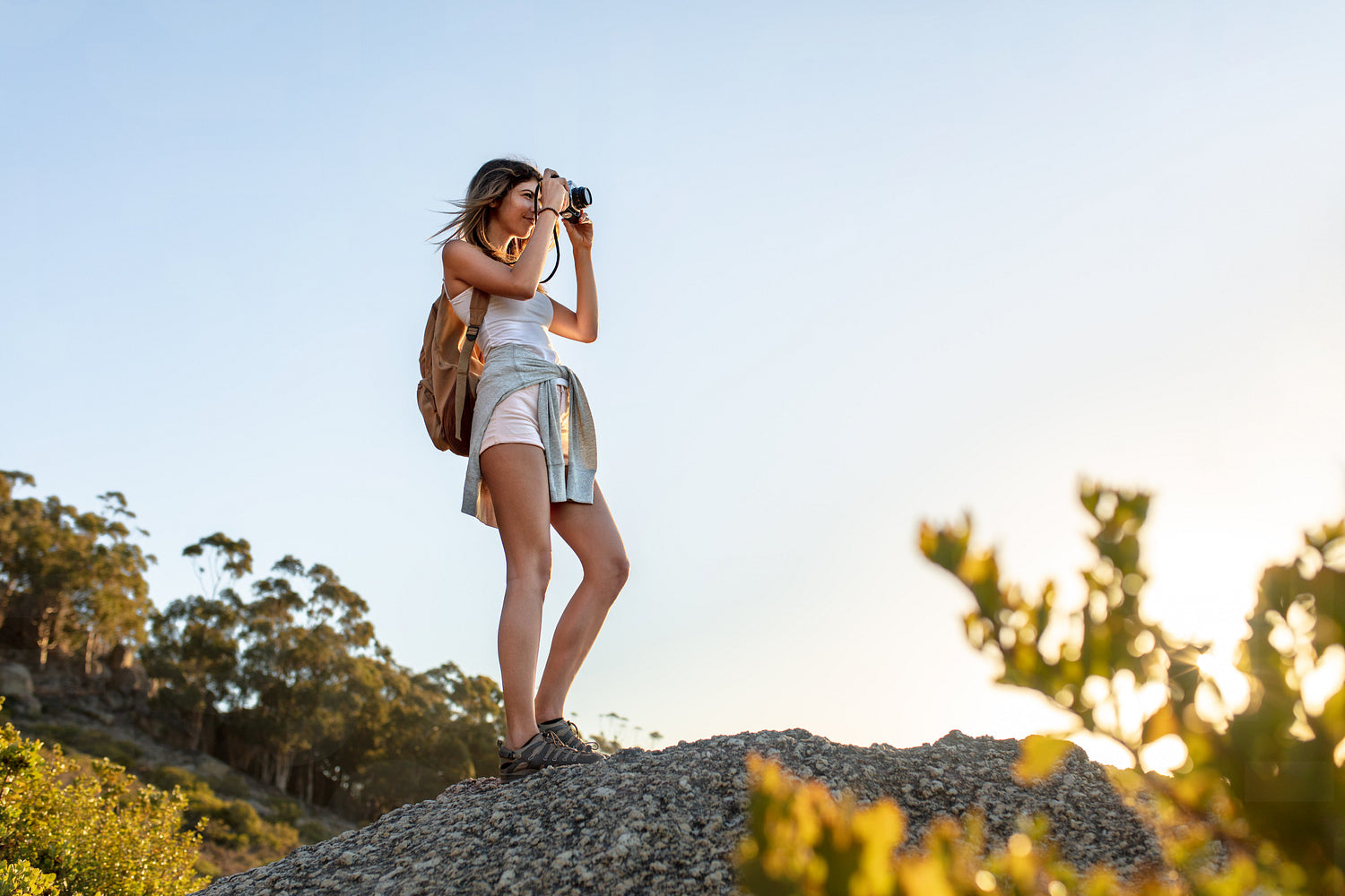 Female hiker taking pictures with digital camera from the top of a hill. Young woman capturing the images of beautiful landscape.