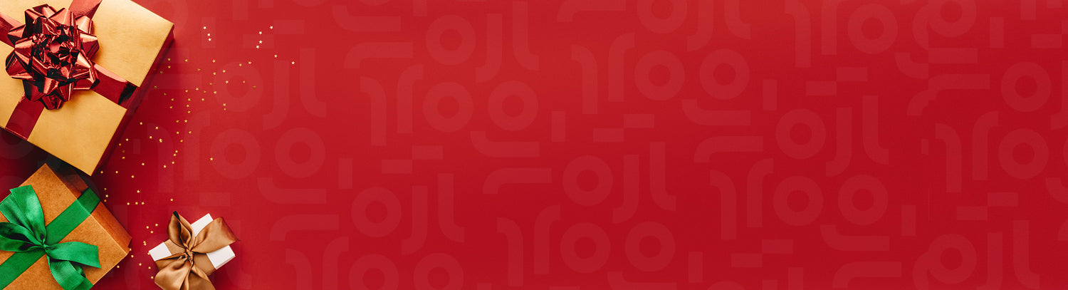 Heap of gift boxes and stars confetti on red background. Christmas background with copy space.