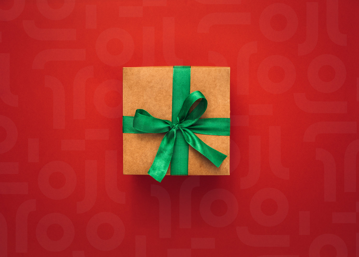 Gift box on red background. Present box with green ribbon bow on colorful background. Flat lay style.
