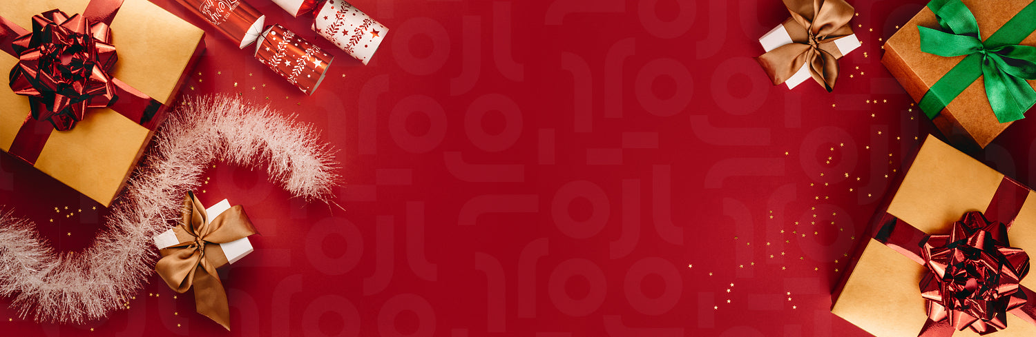 Gift boxes in different sizes with stars and garland with copy space. Flat lay of christmas gifts and decorations on red backdrop. Happy holidays!