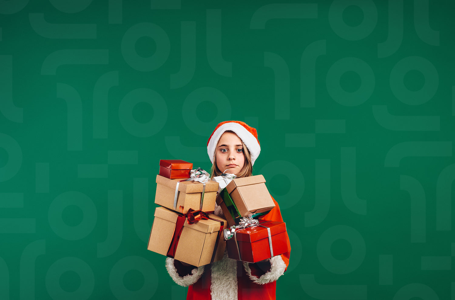 Girl in santa claus dress holding a pile of gift boxes. Kid dressed as santa holding gifts standing against a green background.
