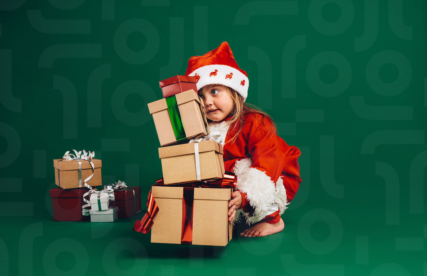 Little girl in santa claus dress lifting a pile of gift boxes. Kid in santa costume playing with gift boxes.