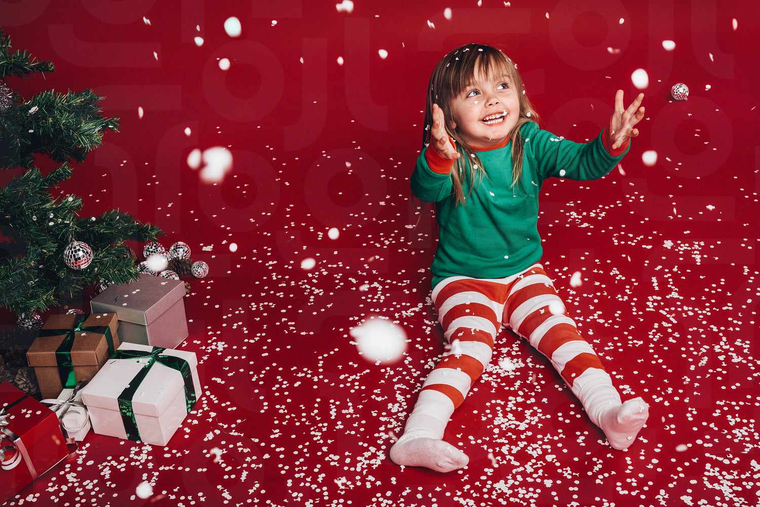 Kid sitting beside a christmas tree enjoying artificial snowfall
