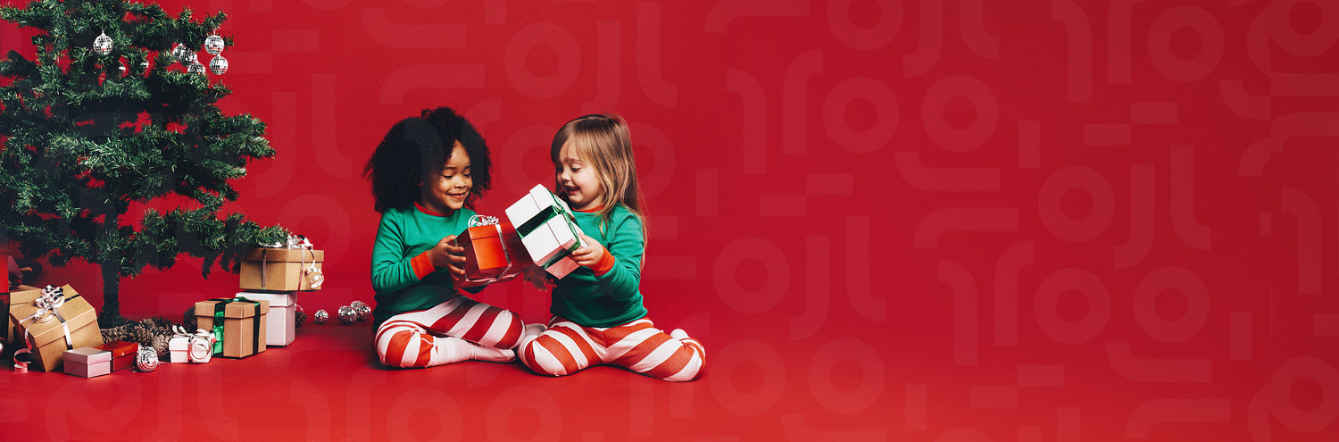 Little girls sitting beside a christmas tree playing with their gift boxes. Kids exchanging christmas gifts on red background.