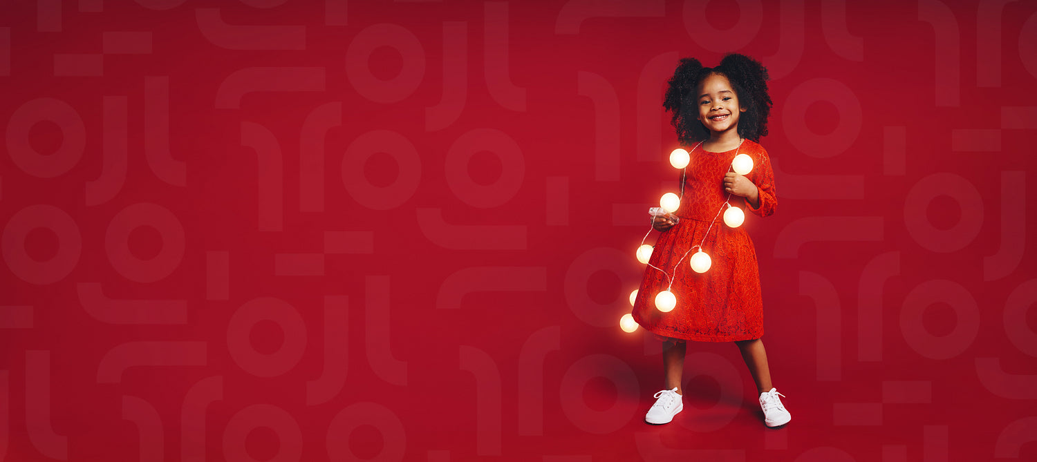 Smiling afro american girl playing with christmas lights. Kid standing against red background wearing fairy lights.