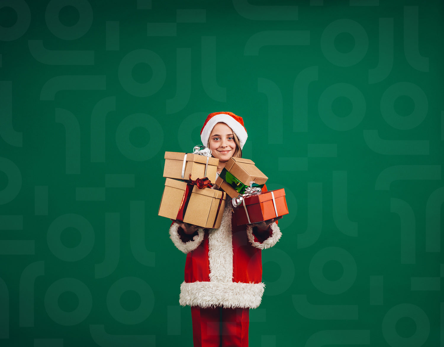 Girl dressed as santa holding christmas gifts standing against a green background. Happy girl standing with her christmas presents.