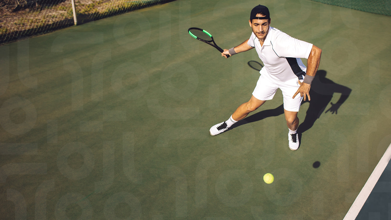 Professional tennis player hitting a forehand while playing on a hard court. Young man in sportswear practicing tennis on a hard court.