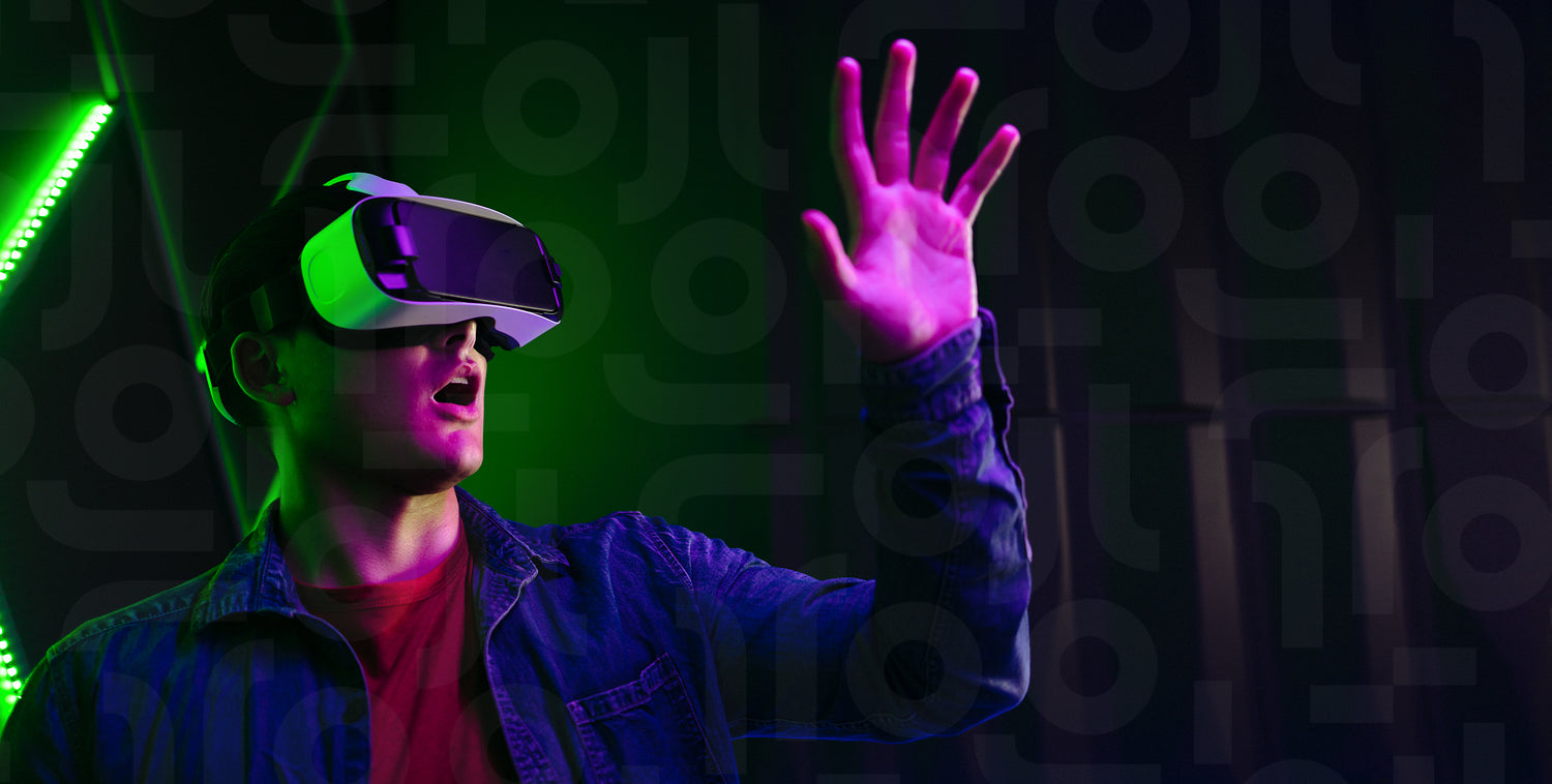 Young man playing an amazing game in virtual reality, wearing a VR headset and interacting with his hands