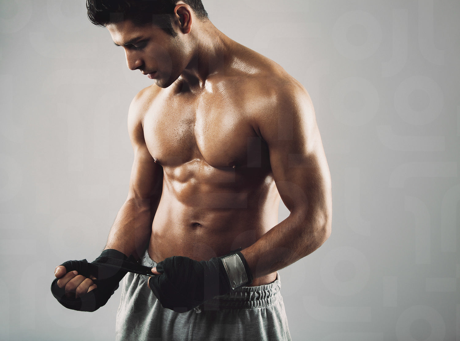 Young male boxer wrapping his hands in boxing tape before a fight. Hispanic young male fitness model.