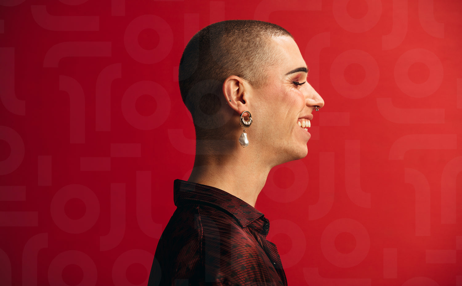 Profile view of androgynous man wearing an earring and makeup smiling. Gay man smiling against red background.