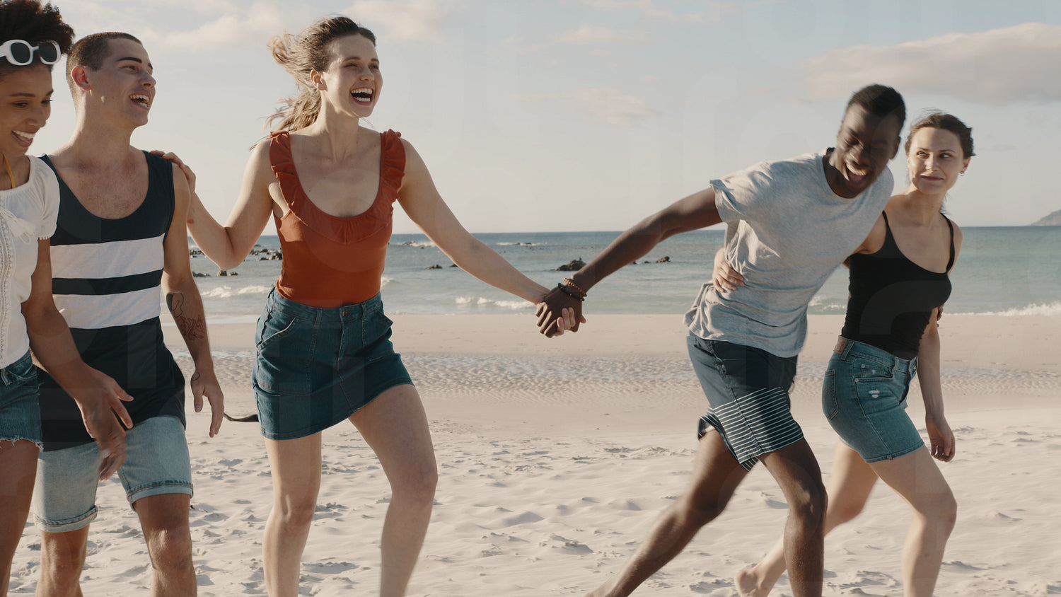 Diverse group of men and women strolling at the beach. Friends enjoying while walking along the beach.